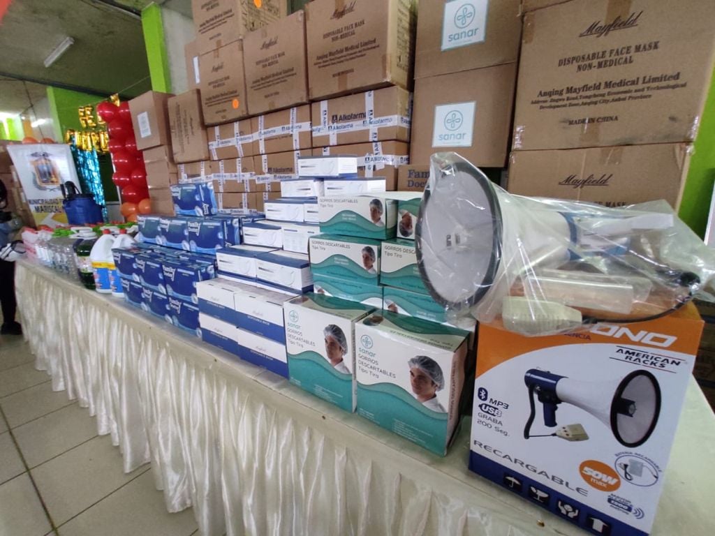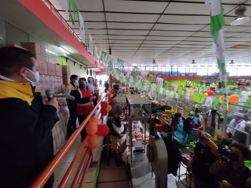 La entrega se concretó en el patio 01 del mercado central, donde se entregó indumentaria e insumos de protección personal como: 1000 cajas de mascarillas quirúrgicas, 500 cajas de redecillas y 100 cajas de guantes; además materiales de limpieza y desinfección como: contenedor de 50 litros para pasillo, termómetro digital, megáfono portátil, mochila fumigadora.