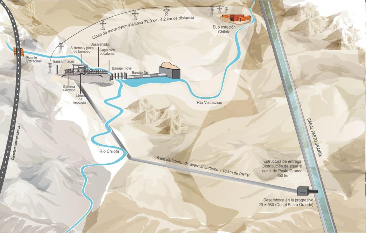 Consiste en la captación y almacenamiento del agua de los ríos Chilota y Vizcachas a través de una bocatoma, para luego ingresar a un sistema de bombeo, que impulsará y conducirá 650 litros de agua por segundo a través de 15 kilómetros de tubería hacia el canal de Pasto Grande y derivar el recurso hídrico a Lomas de Ilo para irrigar 1750 hectáreas en su primera etapa.