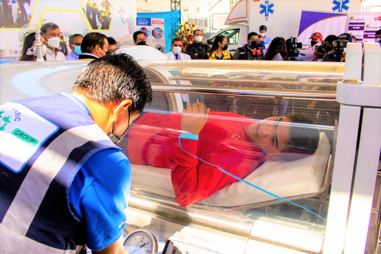 Con una inversión aproximada de US$ 110,000, financiada con recursos provenientes del adelanto de los S/ 100 millones del aporte por responsabilidad social de la empresa Anglo American Quellaveco, y tras la priorización del Consejo Directivo del Fondo de Desarrollo de Moquegua (FDM), se concretó la adquisición, implementación y puesta en marcha del Primer Centro Hiperbárico de Salud Pública en la provincia de Mariscal Nieto, marcando un hito a nivel regional y nacional.